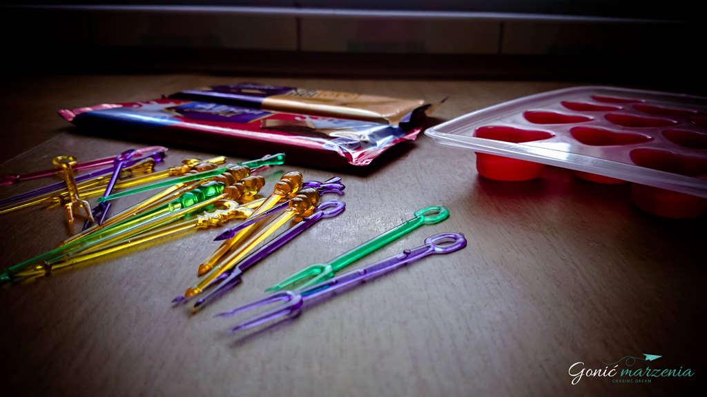 Przygotowałam: 1,5 tabliczki ulubionej czekolady, patyczki, garnek, 1,5 szklanki wody, miskę oraz foremki do lodu. A dokładnie wybrałam 1 tabliczkę czekolady mlecznej, pół tabliczki czekolady karmelowej; foremki w kształcie serduszek oraz kolorowe patyczki – możesz również wybrać patyczki do kawy, które też idealnie się sprawdzą.